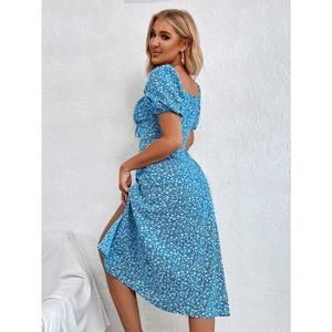 boho Floral Print Knot Front Split Thigh square neck midi Dress