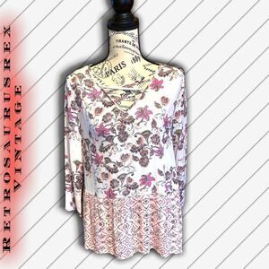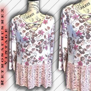 Retrosaurusrex Vintage; vtg; Boho; Rockabilly; hipster; trendy; 1960; 1970; 1980; 60; 70; 80; Bohemian; cottage; fairy; flower; spring; summer; sundress; dress; casual ; edgy; emo; Cloud Chaser Bohemian Pink Floral Ruffled Tunic, Small, Blouse, hippie, namaste, oversized, meditation