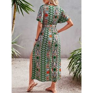 boho paisley Print short Sleeve Split Side Belted maxi Dress green