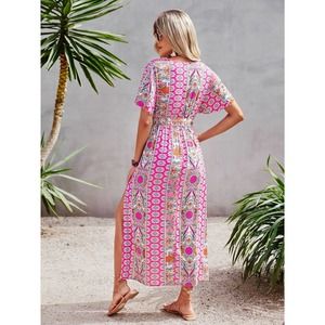 boho paisley Print v neck short Sleeve Split Side Belted maxi Dress hot pink