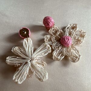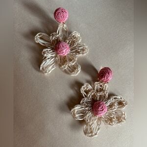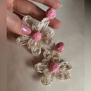 pink and cream bohemian flower dangle drop stud earrings in gold tone