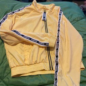 Its yellow and black with white in it , nice and soft its a silk bomber with a zipper , it has a guess lining going down both arms of the bomber. it doesn't have a hood, its good for wearing for fashion. You could wear for a quick run to the store.