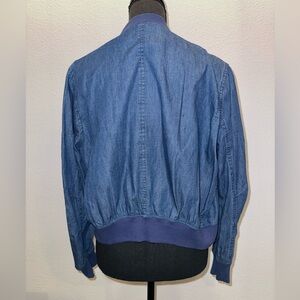 Blue bomber. Light jean material with cotton collar and wrist cuffs. Size Large. Perfect condition. Cute & comfy!