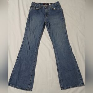 These medium wash jeans feature a stylish flare and wide leg design, offering a modern twist on a classic look. The denim is uniform in color, providing a sleek and polished appearance. Perfect for adding a touch of retro flair to any outfit.size 5