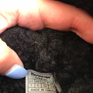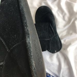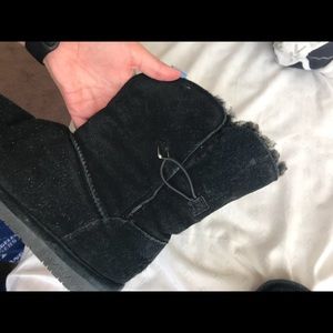 black boots one boots side piece fell off so it has a safety pin to keep it together