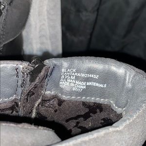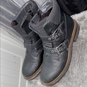 black boots; leather, buckles, straps, and small heel. calf length. never worn, perfect condition