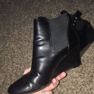 wedged boots. with gold bucket and circles