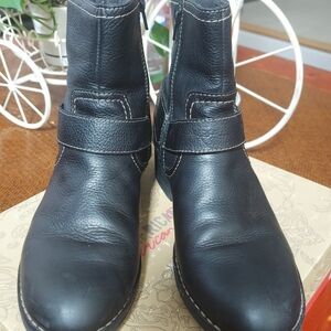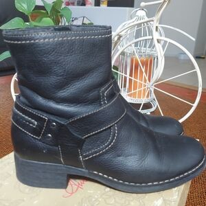 In good condition. With accent stitches. faux leather. Great for jeans. Heel size is for comfort.