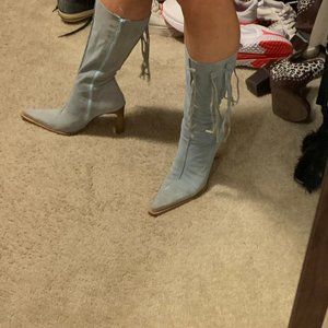 light blue, leather high heel cowboy-like boots with awesome tassels!