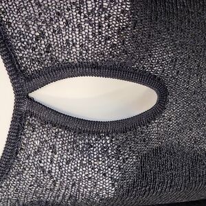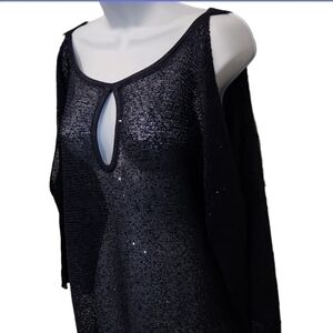 Dark navy with keyhole front detail, 3/4 sleeve with cut out slits, sequins sewn in give this top lots of sparkle in the light. Slight pull in back please see pics, not noticeable while wearing.