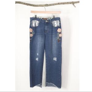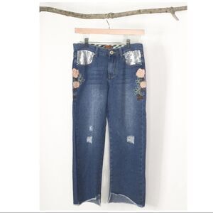 Boyfriend Fit Distressed Jeans with Floral Embroidery On the Side And Sequin Contrast On Inner Pocket.
