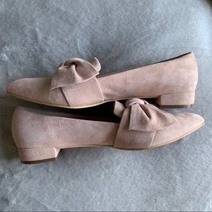 Blush / light pink suede leather loafer by Nordstrom’s bp brand. A casually knotted bow crowns the pointed toe of a charming loafer lifted slightly by a low block heel.