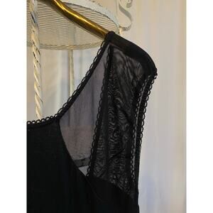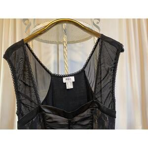 This Black Dress by b.p,c. with Corset-style Bodice with a ruched satin panel in the center front, framed by lace overlays on the sides, giving it a corset-like appearance with Lace and Mesh accenting bodice and sides of dress.