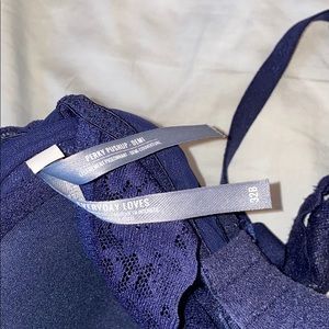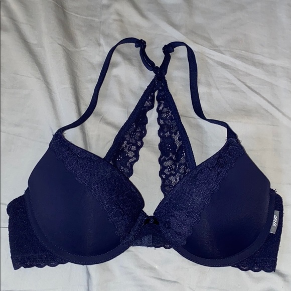 navy blue, lace detail on straps and cups, crossy back, clasps in the back