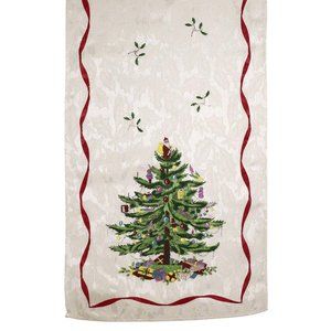 This brand new Spode Whimsical Christmas Tree Table Runner is a 14 x 72 inch rectangle featuring the iconic whimsical tree with a playful Santa on an ivory (not white) woven damask fabric with a Red Ribbony line (they call it "Red Trim") around the perimeter. The fabric is 61% Cotton and 39% Polyester and is machine washable. Brand new, factory-folded in unopened, undamaged, original retail packaging.