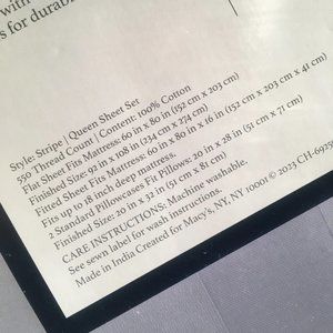 brand new PALE LILAC color Charter Club DAMASK 550 Thread Count 100% Supima Cotton 1.5” Stripe QUEEN Sheet Set ... Queen Flat Sheet, Queen Fitted Sheet, and 2 Standard Pillowcases. The manufacturer's name for the color is Pale Lilac ... it is a very light Purple hue ... and the sheet set is striped. The label on the package states: "QUEEN Flat Sheet finished size is 92 inches x 108 inches. Queen Fitted Sheet is 60 inches x 80 inches and fits mattresses up to 18 inches deep. Each Standard Pillowcase is 20 inches x 32 inches. Machine washable."