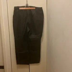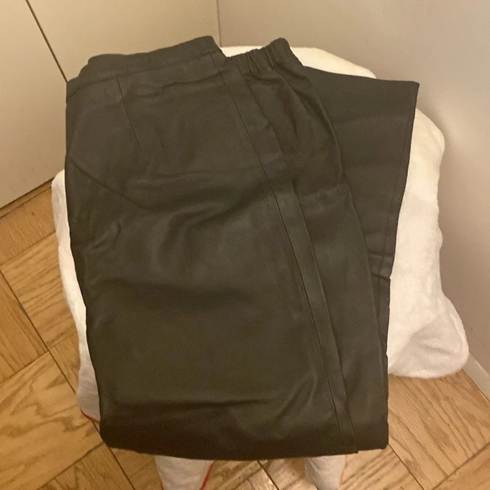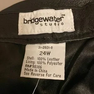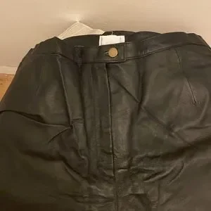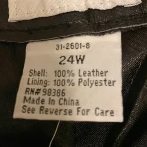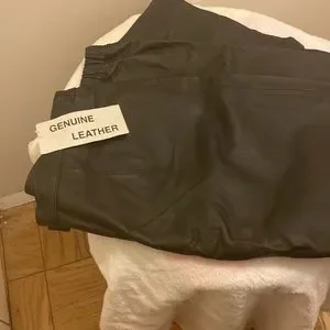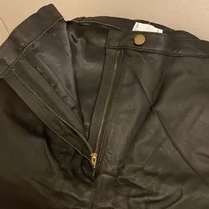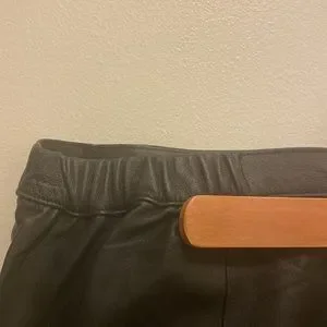 Authentic leather skinnies with inside elastic waistband on side. front zip & button.