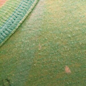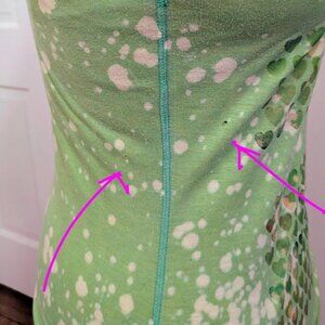 from around 2006- bright springy green with all-over bleach spots and faded metallic rainbow hearts on the front- unfinished edges on hem and sleeves, visible stitching in a darker green - material kind of on the thin side but not completely sheer