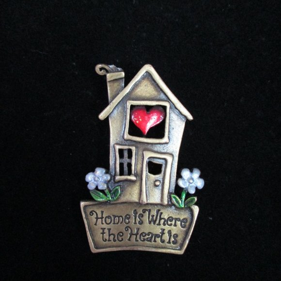 With its heartfelt sentiment, this antiqued brass pin with enamel touches is delightful. On the back is the maker’s mark “© JJ” in a cartouche shape. That copyright designation of the Jonette Jewelry company was used beginning in the mid l980s. It is likely this pin is the late 80s to early 90s. Measuring 2.25” tall and 1.25 wide, this fun and slightly whimsical pin, with its cute house, red heart, and purple flowers, is in very good vintage condition with only light wear.