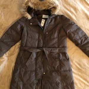 Brown knee length, zip and snap front, tie at waist, detachable faux fur trimmed hood, warm winter coat from Old Navy, size medium. New with tags, retail $89.50.
