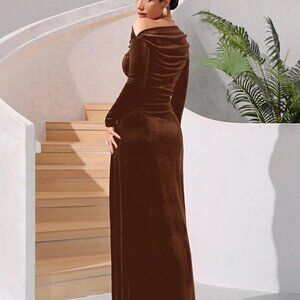 brown Party Women's Asymmetrical Neck Ruched Split Thigh velvet maxi Dress