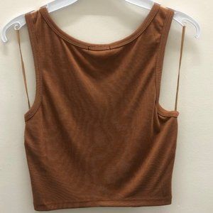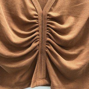 brown cropped tank with front gather in a ribbed slinky material from J&G