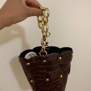 brown leather bucket bag