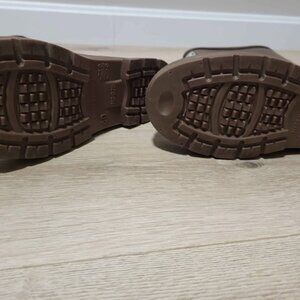 Size 9, flimsy brown rain boots. A few marks on the side but the bottoms are brand new