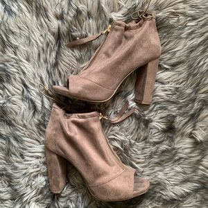 Light brown/muave suede heels with top zipper and elastic cinch details. Worn once on thanksgiving to the living room lol ♡