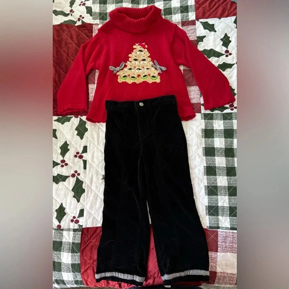 b.t. kids Christmas Reindeer Embroidered Knit Red Sweater & Black Corduroys Sz 4