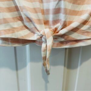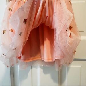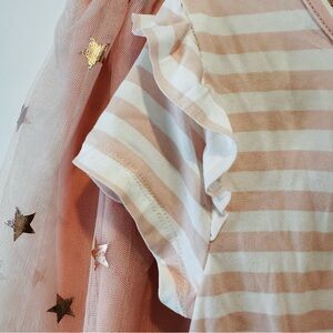 Adorable striped tee with glitter star. Ruffled sleeves and tie front. Matching star-patterned tulle skirt.