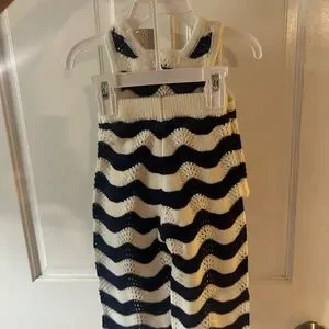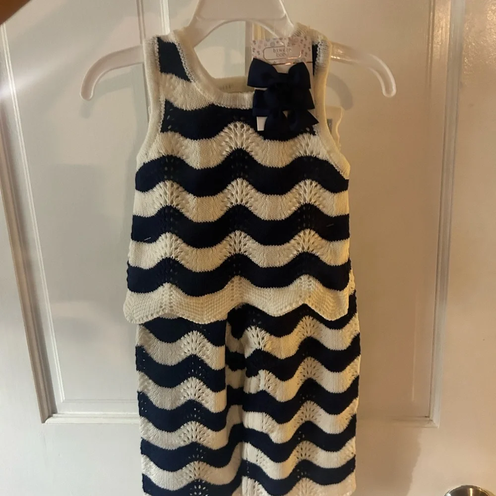 Stylish knit set with navy and white wave pattern. Sleeveless top with bow detail. Comfortable matching shorts.