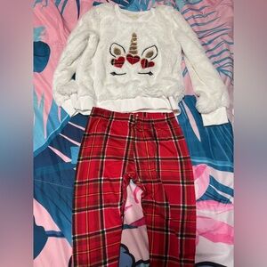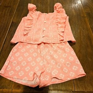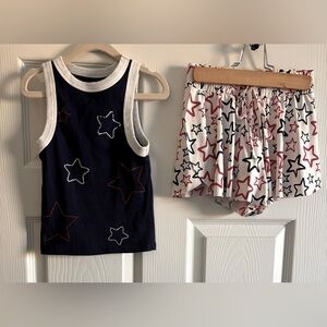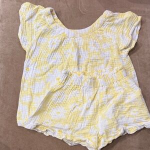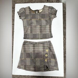 Navy top with ruffle detail. Yellow and navy plaid skirt. Perfect for stylish outings.