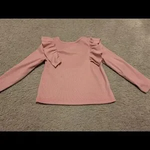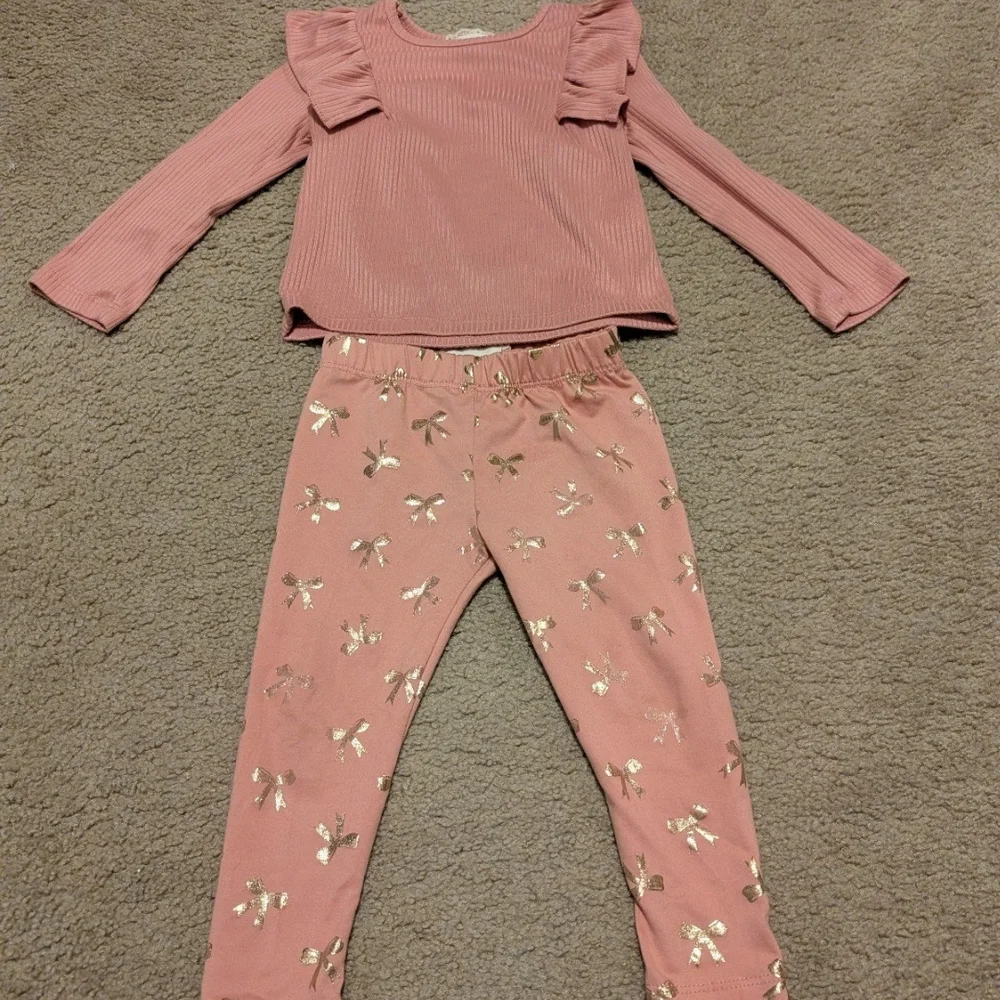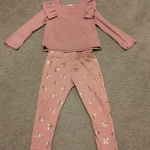 Adorable pink top with ruffle sleeves. Matching pink leggings with gold bow patterns. Perfect for stylish outings.