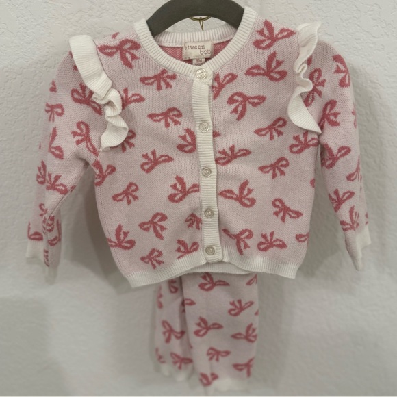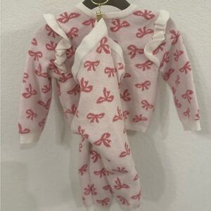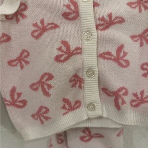 Charming sweater with pink bow design with matching pants. Features button closure.