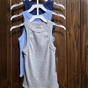 Set of ribbed tank tops in gray, light blue, and dark blue. Comfortable and stylish. arn