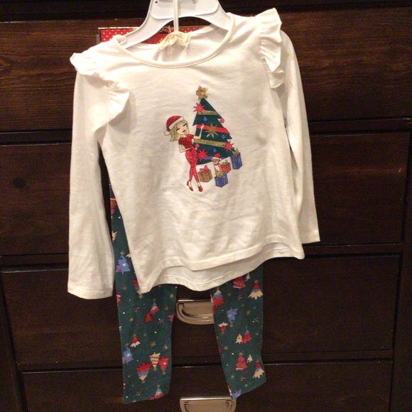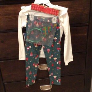 Adorable kids matching set by btween. White top with festive print. Green leggings with holiday pattern. Perfect for celebrations.