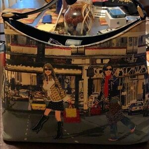 Bueno purse. NWT. Shoulder strap. Exquisite beadwork to add detail on this purse. Beadwork only on front of purse. City scene (2 women carrying bags on a city street with traffic, bridges, and subway).