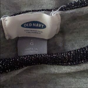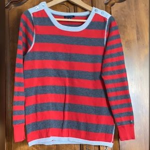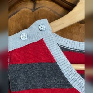 1- grey/red striped long sleeve shirt with buttons on shoulders. Can use as a shirt or light sweater