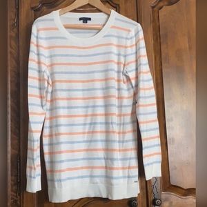 1- white/orange/light blue long sleeve shirt. Can use as a shirt or light sweater