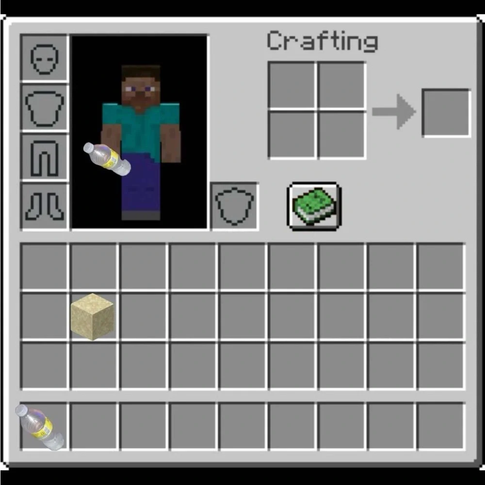 Unique Minecraft inventory screen print. Features character holding a bottle and sand block. Perfect for gaming enthusiasts.