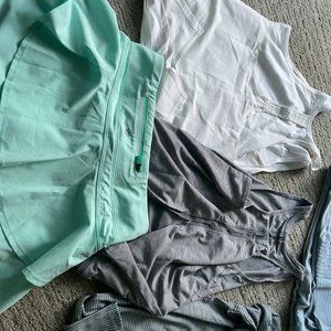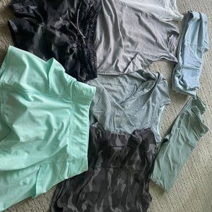Two shorts, one skort, two tanks, one tee, one long sleeve pullover size M (tanks and skort, and camo shorts are in like-new condition, tee and black shorts in good condition)