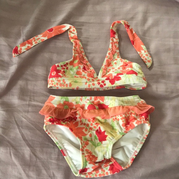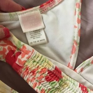 Janie and jack bikini 12-18m guc. Some slight snagging on back bottom and under front on one side as pictured. Elastic back on top and tie at neck. Elastic is still stretchy. Smoke free home.