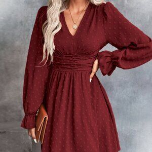 burgundy Boho Women's Swiss Dot Ruched Waist Flounce Sleeve Dress