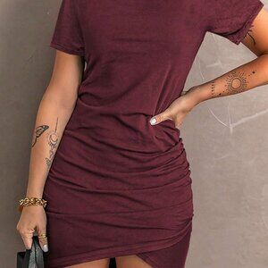 burgundy Casual Womens Solid Ruched Tulip Hem Dress