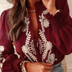 burgundy boho Women's Casual Embroidered Floral button down Shirt