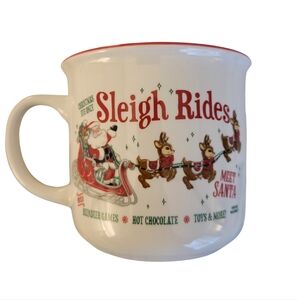 Design: The phrase “Sleigh Rides” is printed in bold, classic red font across the top. Below, there’s a detailed illustration of Santa Claus in his sleigh with his trusty team of reindeer. The mug's crisp white background provides the perfect contrast, making the red text and illustration pop with cheerful holiday spirit.