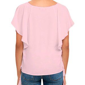 This adorable semi-sheer butterfly sleeve top with tasseled ties is flirty and fun.