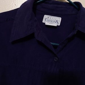 Dark Blue Button down that is very soft. It' worn, but doesn't look it. It's a S but could definitely fit up to L, its very big.