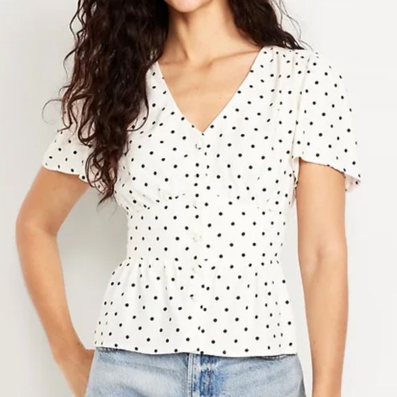 white/cream polka dot vneck blouse, petite but fits like a normal small
